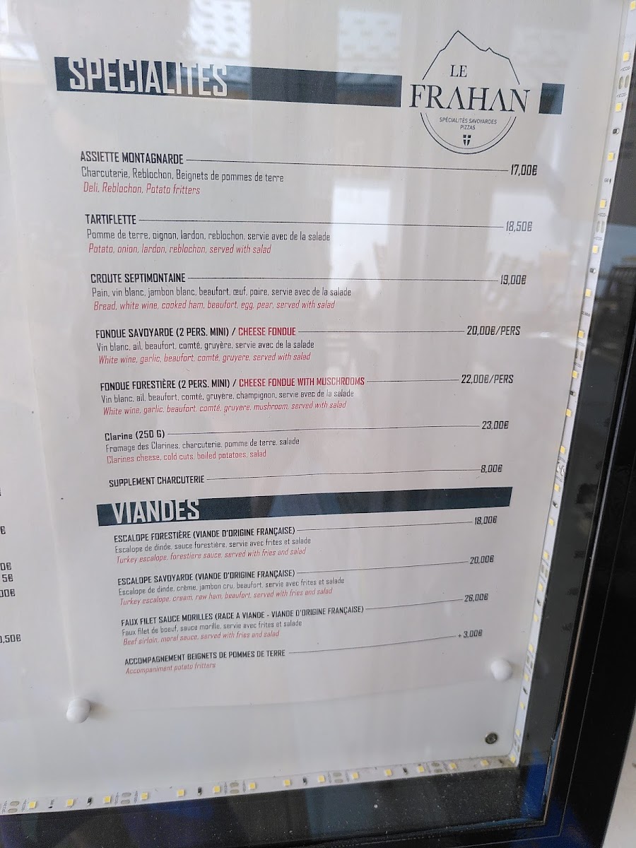 Introducing the menu at Le Frahan, a delightful gem nestled in Samoëns, France. This cozy restaurant offers a diverse selection sure to please every palate. From mouthwatering pizzas to hearty steak and tender escalope, the menu caters brilliantly to both adults and teens. Vegetarian options abound, ensuring everyone finds something appealing.